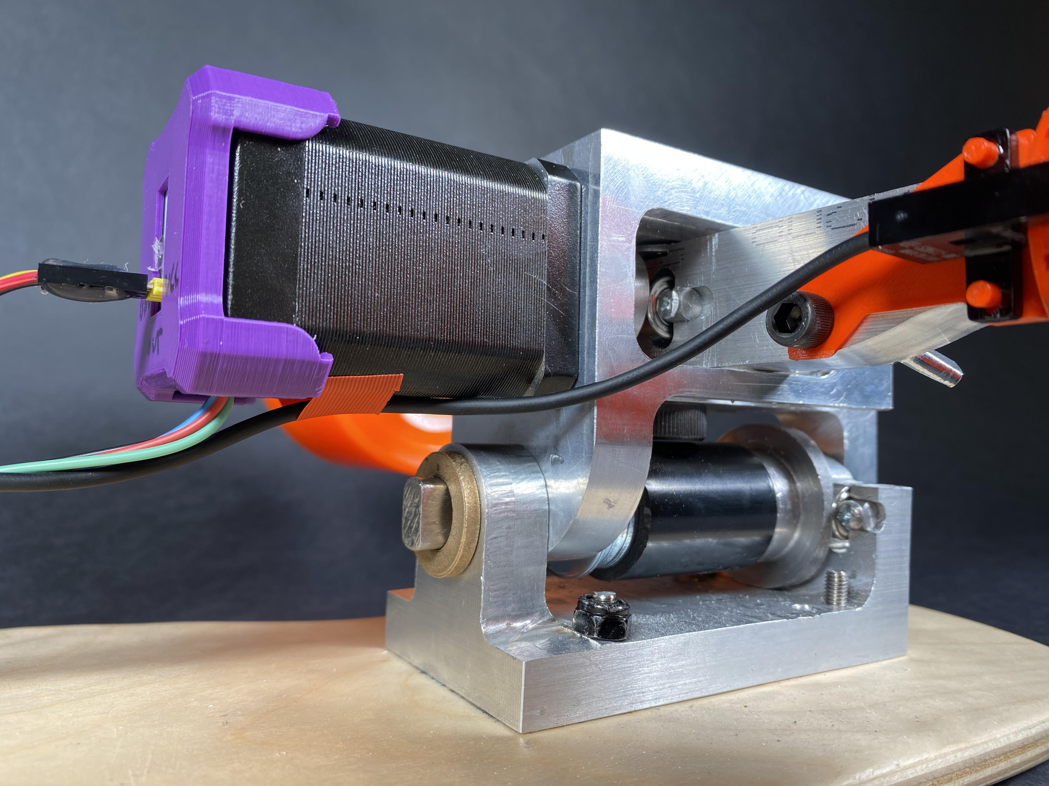 Actuatingthehangersthatcontroltheturningradiusoftheboardwasadiscussionwehad manytimesasateamandwithLSD.Thesolution’scomplexitywasincreasingrapidlyandwe neededthesimplestwaytoactuatethehangerstoreduceanyfurtherincreaseincomplexity.We decidedtouseasteppermotorforthepositionalaccuracyitprovidesandthetorque-to-sizeratio thatitoffers.Therewouldbeamotormountedonbothtrucksandtheywillworktogethertoturn theboardbyprovidingtheirrespectivehangerangles.