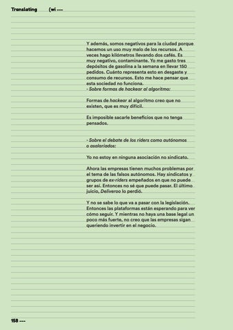 Y además, somos negativos para la ciudad porque hacemos un uso muy malo de los recursos. A veces hago kilómetros llevando dos cafés. Es muy negativo, contaminante. Yo me gasto tres depósitos de gasolina a la semana en llevar 150 pedidos. Cuánto representa esto en desgaste y consumo de recursos. Esto me hace pensar que esta sociedad no funciona. - Sobre formas de hackear al algoritmo: Formas de hackear al algoritmo creo que no existen, que es muy difícil. Es imposible sacarle beneficios que no tenga pensados. - Sobre el debate de los riders como autónomos o asalariados: Yo no estoy en ninguna asociación no sindicato. Ahora las empresas tienen muchos problemas por el tema de las falsos autónomos. Hay sindicatos y grupos de ex-riders empeñados en que no puede ser así. Entonces no sé que puede pasar. El último juicio, Deliveroo lo perdió. Y no se sabe lo que va a pasar con la legislación. Entonces las plataformas están esperando para ver cómo seguir. Y mientras no haya una base legal un poco más fuerte, no creo que las empresas sigan queriendo invertir en el negocio.