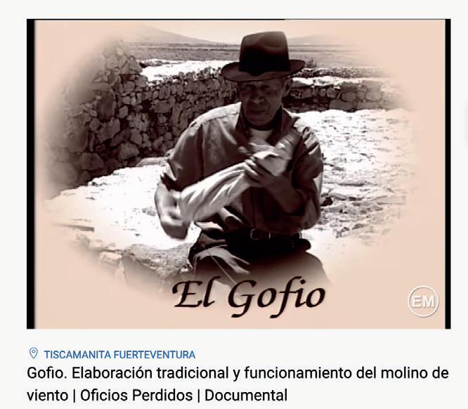 Documental en YouTube donde se explica el proceso tradicional para la elaboración del gofio, los distintos cereales que se utilizan y los instrumentos más rudimentarios que permiten tostar y moler los granos. Además, se incluye información sobre la preparación del zurrón de cuero de cabra para amasar el gofio.