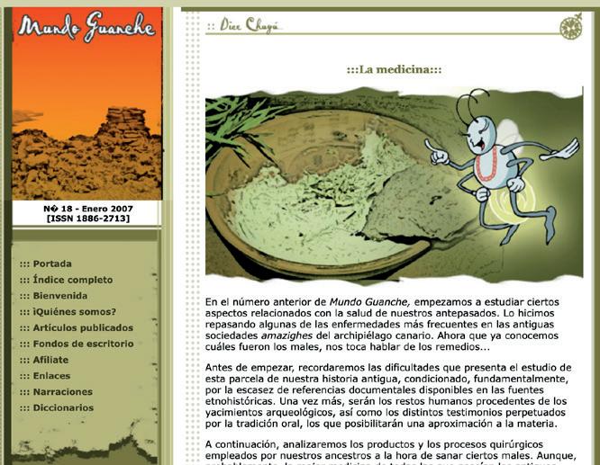 Página del site “Mundo guanche” donde se ofrece información relevante sobre las plan tas medicinales utilizadas por los pobladores guanches para curar, así como algunos pro cedimientos quirúrgicos que practicaban. Del mismo modo, se comentan las enferme dades más comunes que padecían estos po bladores.
