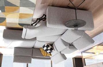 Dreieck-Hocker in Stoff Mileto steel; 59x59cm; H33cm 219,Couchtisch COSMIC Platte HPL galaxus ca. 50x65 cm; H40 cm; Metallgestell schwarz 239,-