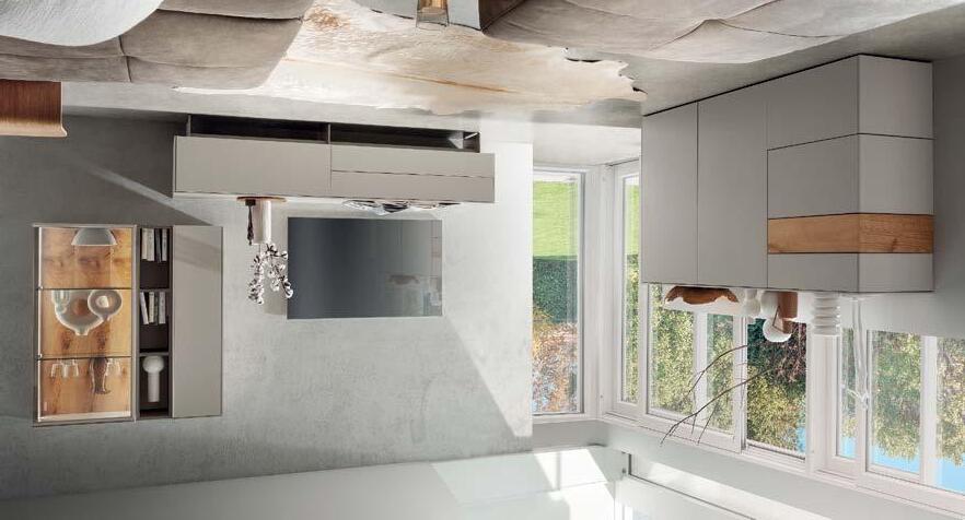 Ausführung: Lack cashmere mit Akzentabsetzung in Eiche furniert, Push-To-Open-Griffe. Bestehend aus: Lowboard inkl. Klappe, Schubkasten und Auszug, Hängeschrank inkl. Tür, offenem Zwischenregal und Winkelglastür, ca. B.300/H.196/T.45 cm, Preis 6.418,Wohnwand pl.Giorno (Abb. rechts)