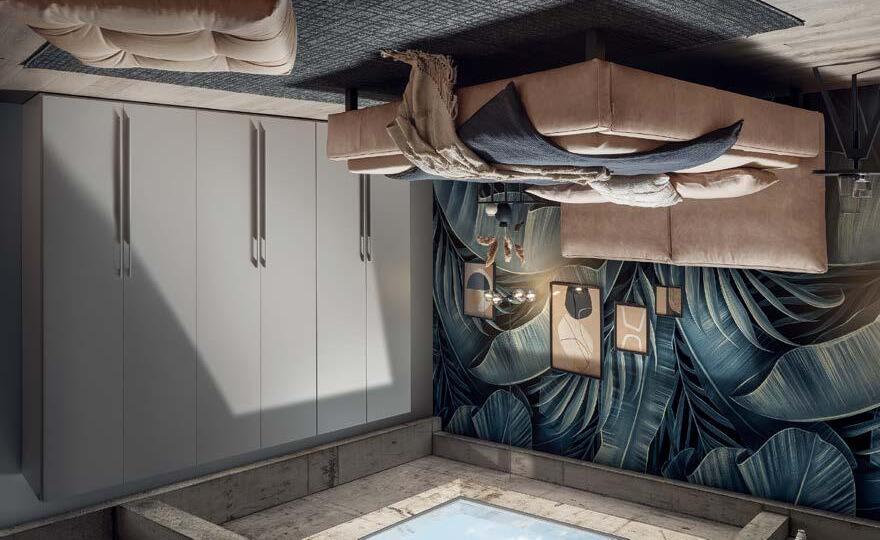 Abb. oben rechts: pl.Malu 2.0 Polsterbett, Größe 180x210 cm, Sitzhöhe 66 cm, in Stoff Bloq Eucalyptus, inkl. Rost starr und Matratze pl.Jack, Preis 4046.-