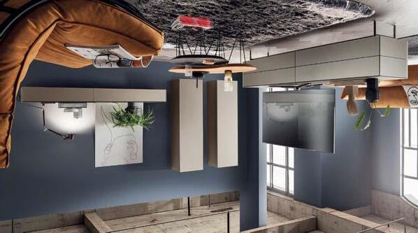 Ausführung: Lack cashmere mit Akzentabsetzung in Eiche furniert, Push-To-Open-Griffe. Bestehend aus: Lowboard inkl. Klappe, Schubkasten und Auszug, Hängeschrank inkl. Tür, offenem Zwischenregal und Winkelglastür, ca. B.300/H.196/T.45 cm, Preis 6.418,Wohnwand pl.Giorno (Abb. rechts)