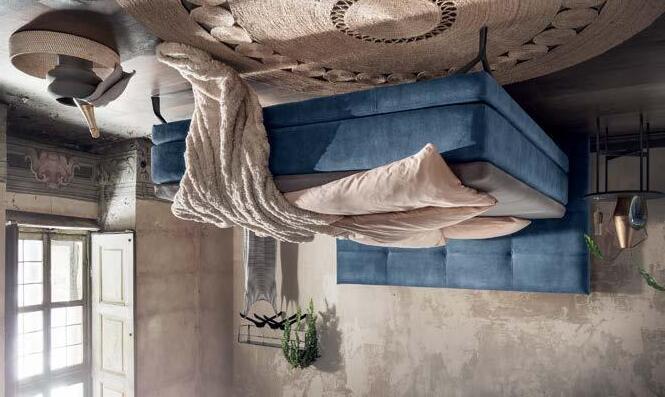 Abb. links: pl.Malu 2.0 Boxspringbett, Größe 180x210 cm, Sitzhöhe 57 cm, in Stoff Adore Indigo 90, inkl. Matratze Pure 20, Preis 4820.-