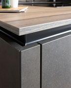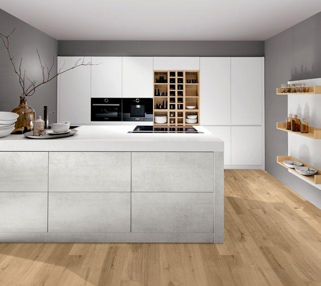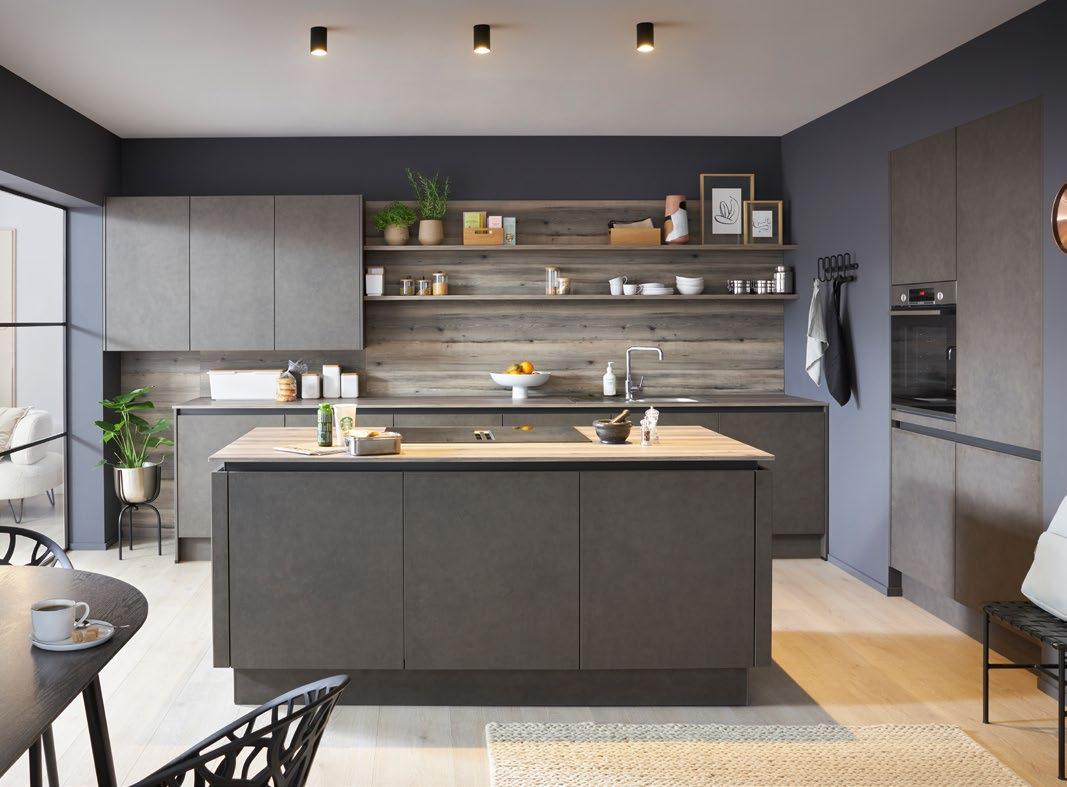 Beton schiefergrau Nachbildung kombiniert mit Eiche im Wandpaneel, das mit klaren Linien Stauraum bietet. Offen und repräsentativ für alles, was Du zum Kochen oder Glücklichsein brauchst. Noch mehr Stauraum versteckt sich in der Insel – grifflos über die schicke schwarze Griffmulde zu erreichen, die Deine Arbeiteplatte schweben lässt.