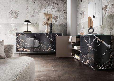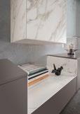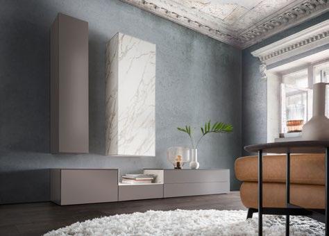 Ausführung: Lack matt Gipsy, Keramik Calacatta silk, Push Pull, bestehend aus: Lowboard, Kombination aus Lack und Keramik, 2 Schubkästen, 1 Klappe, 1 Türe links, ca. B.240 / H.36 / T.45 cm, Hängeschrank mit Türe links, Front Lack matt, ca. B.30 / H.144 / T.35 cm, Hängeschrank mit Türe rechts, Front / Sichtseiten Keramik, ca. B.50 / H.144 / T.35 cm, Preis 5997,05. Sideboard pl.Giorno