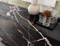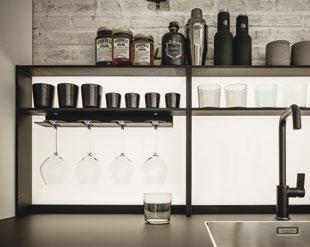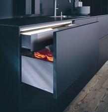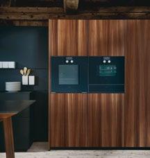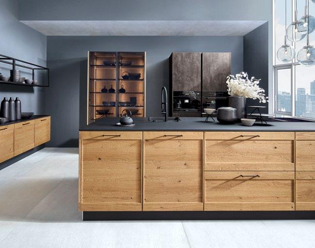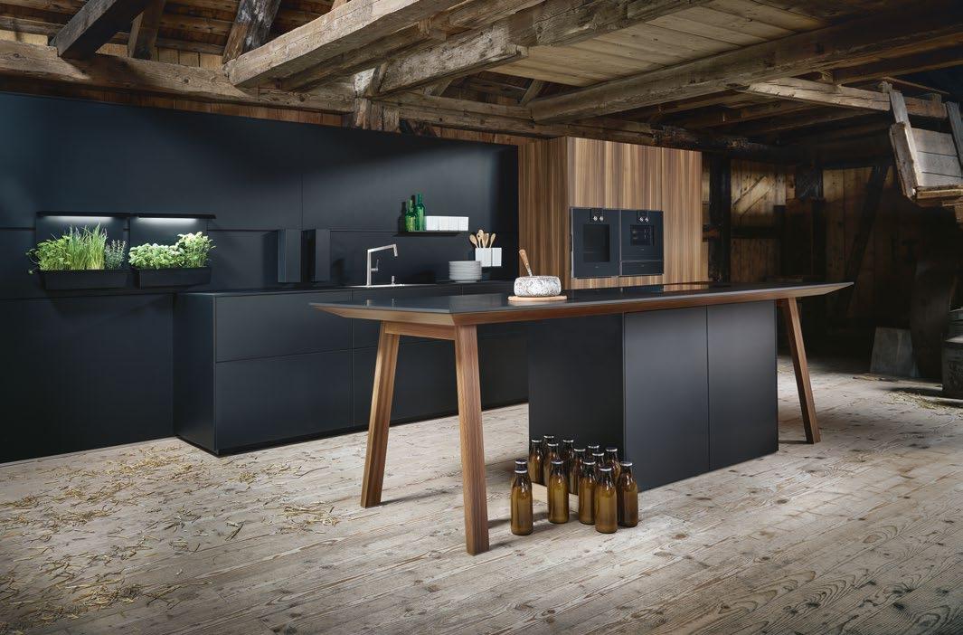 Die elegante Maserung des Lärchenfurniers, seine Ästhetik, die sich nicht aufdrängt, aber dennoch ein klares Statement abgibt, macht diese NEXT125 Küche zu einem außergewöhnlichen Stück. Gerade der Kontrast von Onyxschwarz zu geräucherter, gebürsteter Lärche, lässt den bewusst abgesetzten Technikblock besonders wirken. Highlights sind der minimalistische Kochtisch, die Unterschränke mit ihren extra niedrigen Sockeln von nur 5 cm und den Schüben mit integrierter Beleuchtung. Der Kräutergarten wird mittels Tageslichtröhre beleuchtet, damit alles natürlich wächst.
