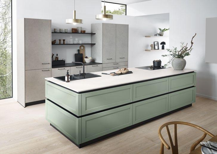 Großzügiger Auftritt mit einladender grüner Insel und eleganten Großauszügen. Die Contur Küchenkombination 56.220/ 52.210 ist eine moderne Interpretation des Countryhaus-Stils. Die salbeigrünen Kassettenfronten der Kochinsel erinnern an diesen Stil, die grifflosen, von allen Seiten zu öffnenden Großauszüge wirken dieser Assoziation entgegen und verschaffen der Küche eine aufgeräumte, reduzierte Optik.