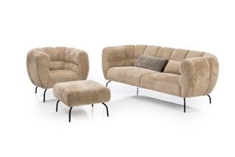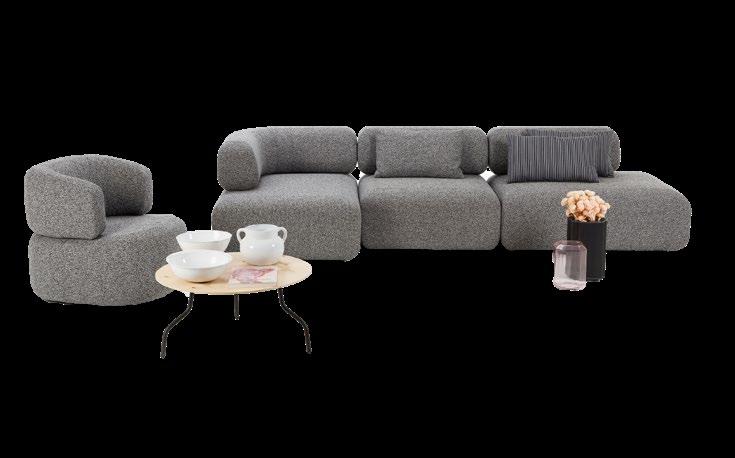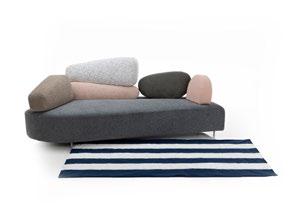 Die weich geschichteten, abnehmbaren Lehnen – inspiriert von rund geschliffenen Kieseln – sind individuell konfigurierbar. Die Sitzbasis mit Federkern bietet hohen Komfort, abzieh- und erneuerbare Bezüge machen mosspink langlebig.