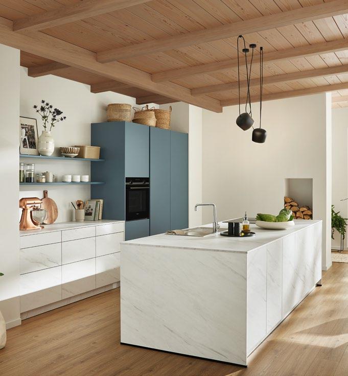Zeitlose Eleganz, wohnliche Wärme und handwerkliche Perfektion. Das Zusammenwirken von Stahlblau und weißer, edler Marmorfinesse entfaltet ein erfrischendes Flair und elegante Modernität gleichermaßen. Zentrum dieses gelungenen Küchenentwurfs ist die weitflächige und doch leicht anmutende Kücheninsel. Stellmaße: Küchenzeile ca. 370 cm, Insel ca. 304 cm Hochwertige Markengeräte von SIEMENS: Backofen HB517ABS0, Energie-Effizienzklasse A (Skala von A+++ bis D), Muldenlüfter ED811FQ15E, Energie-Effizienzklasse B (Skala von A+++ bis D), Kühlschrank KI82LADD0, Energie-Effizienzklasse D (Skala von A bis G), Preis 16.790,- ohne Dekoration