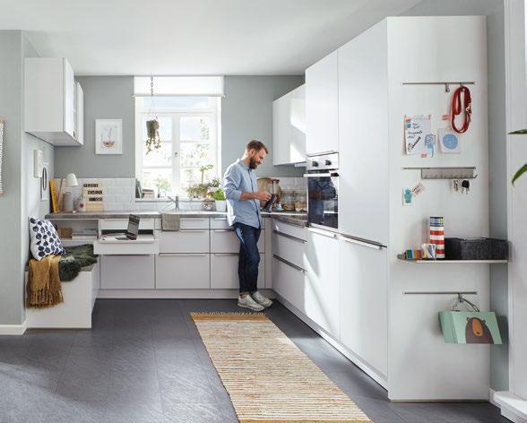 Eine Küche muss im Familienalltag manchmal ganz schön was aushalten können. Da wird gekleckert, wieder gewischt, angestoßen und, und, und –und natürlich soll sie von ihrer Schönheit nichts einbüßen. Die Küche Global 52.180* mit RESOPAL® -Fronten in Kristallweiß matt ist wie gemacht für die junge Familie. Edelstahlfarbene Griffleisten und eine Arbeitsplatte in Cubica Betongrau verleihen der smarten U-Küche einen modernen Look. Ein Orgapaneel mit Zubehör, ein Oberschrank mit Schiebetüren, eine Sitzbank und ein Ausziehtisch sind im Preis inclusive. Stellmaße ca. 154 x 305 x 278 cm. Küche ausgestattet mit Markengeräten von Juno: Edelstahl-Backofen JB040A2, Energie-Effizienzklasse A (Skala von A+++ bis D) GlaskeramikKochfeld JKSN604F5, Flachschirmhaube JDF905E2, Energie-Effizienzklasse B (Skala von A+++ bis D), Kühl-/Gefrierschrank JCU178E0S4, Energie-Effizienzklasse E (Skala von A bis G), Stellmaße: U-Küche ca. 154 x 305 x 278 cm. Küche 7.990.- € / Lieferpreis. Ohne Dekoration.