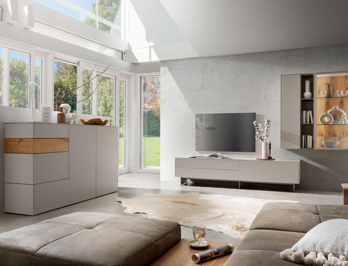 Ausführung: Lack cashmere mit Akzentabsetzung in Eiche furniert, Push-To-Open-Griffe, inkl. 2 Schubkästen, 2 Auszügen und 2 Türen, ca. B.182/H.109,7/T.45 cm, innen und außen Melamin weiß, Außenverblendung 1 cm Lack Cashmere, Preis 3841,02. Wohnwand pl.Giorno