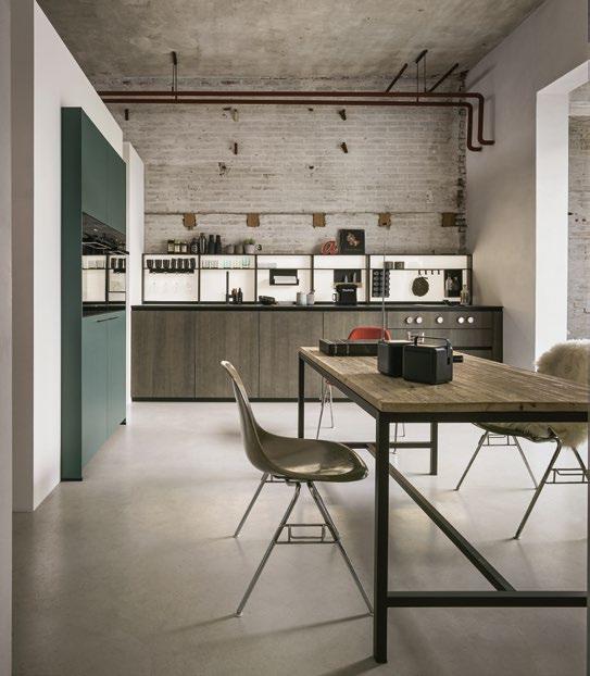 Ein Raum, wie mit dem Meißel behauen. Darin eine Zeile von Küche, ebenso kernig wie elegant. Fronten aus Eiche graphitgrau treffen auf kobaltgrüne Lackmöbel. Und alles voll auf Funktion getrimmt. Der Herd mit Knöpfen zum Drehen, die Arbeitsplatte aus Ceramic, dahinter das hinterleuchtete Regalsystem Frame – mit den besten Freunden des Profikochs: ausgesuchte Gewürze, scharfe Messer, feine Gläser und Gefäße.