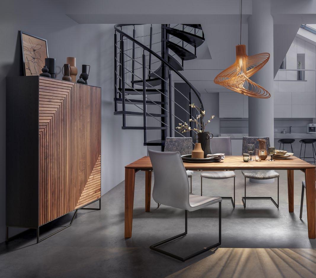 Ausführung: Nussbaum-Splint massiv, Oberfläche: Hartwachssiegel geölt, inkl. 2 Klappauszügen, ca. B.220-320/H.75/T.100 cm, Preis Nussbaum 3396,-, Mehrpreis Auszüge 1579,-, Mehrpreis Splint 498,03. Freischwinger pl.Konah als Freischwinger oder Vierfußstuhl, mit oder ohne Armlehnen erhältlich, ca. B.50/H.96,5/T.60 cm, in Stoff ab 462,-, in Leder ab 542,04. Hängeleuchte Lodi
