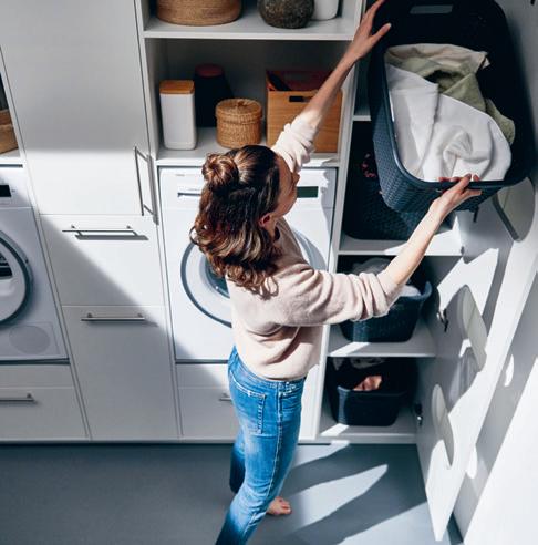 Es gibt nichts Praktischeres, als alles auf einer Ebene und direkt Zugriff zu haben. Gerade unser Hauswirtschaftsraum, hinter die Küche integriert, ist das beste Beispiel dafür. Hoch eingebaut sind z. B. der Trockner oder die Waschmaschine – absolut praktisch und rückenfreundlich. Die perfekte Lösung, so ein Hauswirtschaftsraum. Und alles hinter einer Schiebetür: Einfach Tür zu und wir sind für Gäste bereit.