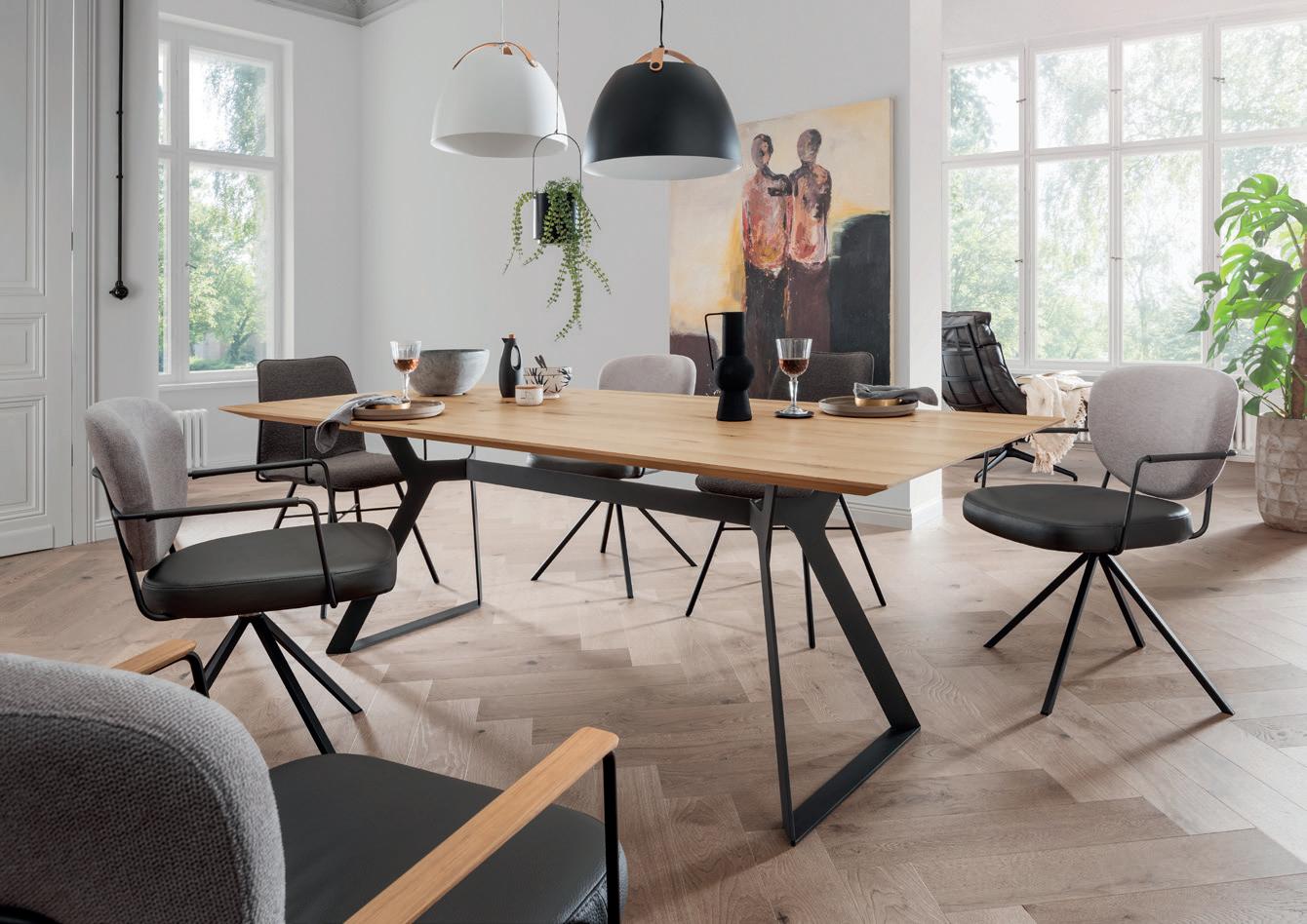 Ausführung: Eiche wild massiv mit Baumkante, Gestell: Flachstahl schwarz pulverbeschichtet, Länge in 10 cm Schritten von 200 bis 260, Breite 90-105 cm, Höhe 76 cm, Preis ab 3007,07. Drehstuhl pl.Kalma mit Dreh-Mooverfunktion und Rückholfeder, ca. B.60/H.82/T.60 cm, Preis in Stoff ab 577,-, Preis in Leder ab 730,-