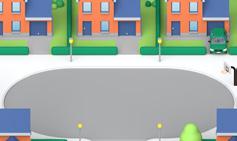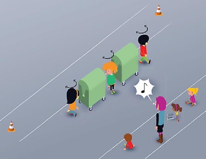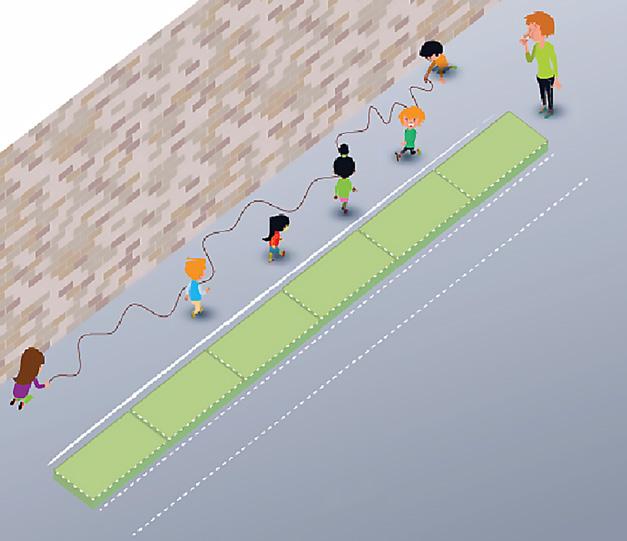 Maak een straat met stoeprandstroken of krijt. Voorzie langs beide kanten een stoep. Plaats op de rijbaan langs de stoeprand twee grote vuilnisbakken, die stellen geparkeerde voertuigen voor. Plaats twee kegels op de stoep langs de kant van de voertuigen.