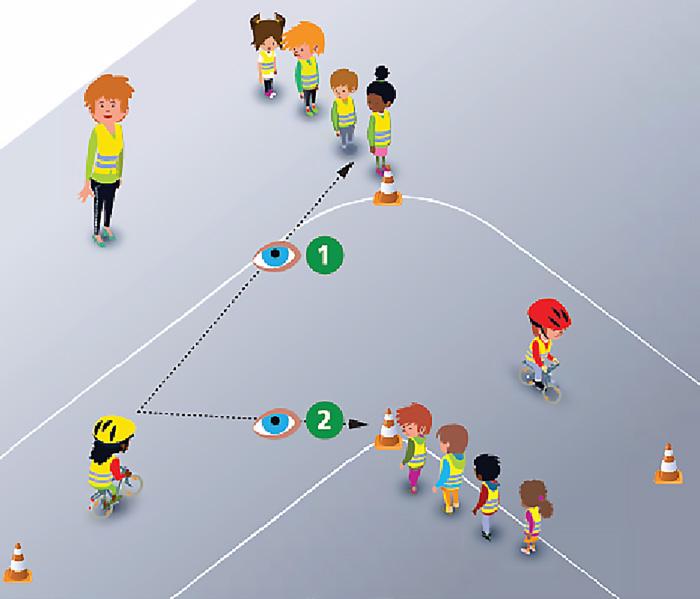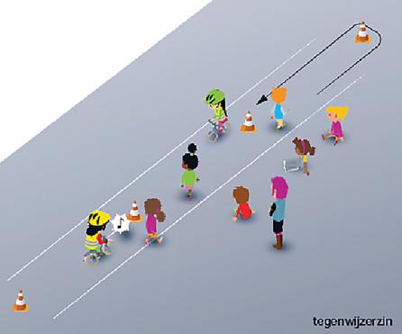 De helft van de leerlingen staat aan de kant en observeert de situatie. De andere leerlingen zijn ofwel voetganger en stappen op het fietspad (omdat er geen stoep is), ofwel fietsers die in tegenwijzerzin rond de kegels rijden. De voetgangers zien zo de fietsers naderen en gaan eventueel meer aan de kant staan om de fietsers door te laten. Herhaal de oefening, nu rijden de fietsers in wijzerzin. Als de fietsers een voetganger naderen, bellen ze. De voetgangers kijken achterom en gaan opzij staan om de fietsers voorbij te laten rijden.