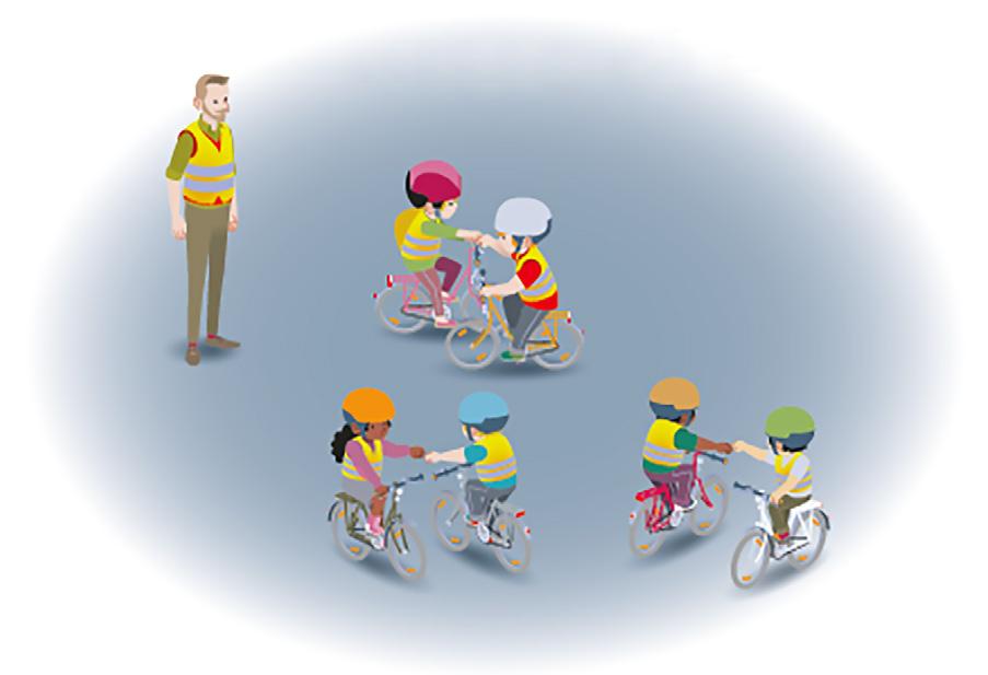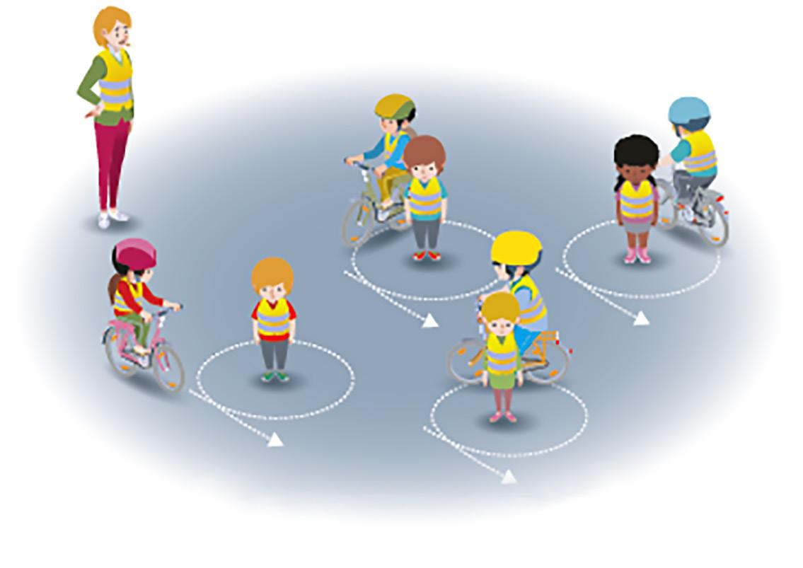 Verdeel de leerlingen in twee groepen. Eén groep leerlingen zijn de ‘standbeelden’. Die verdelen zich over de ruimte op minstens vier meter van elkaar. De andere groep leerlingen geef je de opdracht om minstens één keer rond elk standbeeld te fietsen. Wanneer ze klaar zijn, fietsen ze naar de leerkracht, stappen af en zetten hun fiets op de staander. Daarna wisselen de groepen.