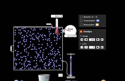 Het volume kan je aanpassen door het handvat links te verschuiven, de gasdruk kan je aflezen. Let goed op de bewegingen van de gasdeeltjes.