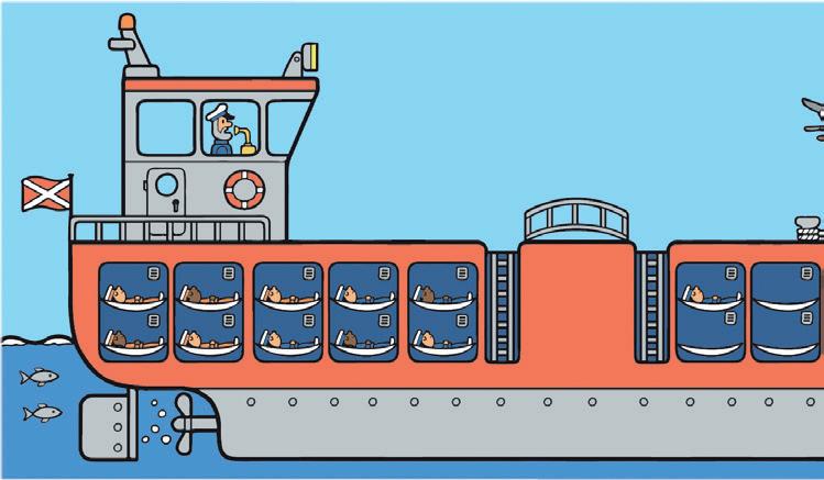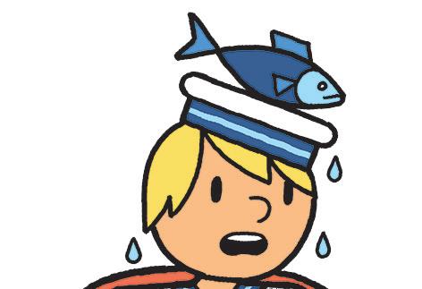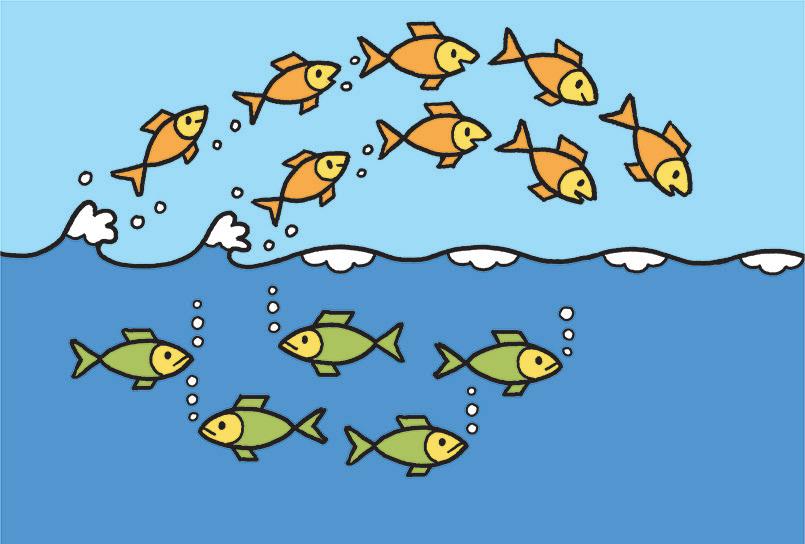 eerst zijn er 3 blauwe vissen, dan komen er 5 gele bij. nu zwemmen er samen 8.