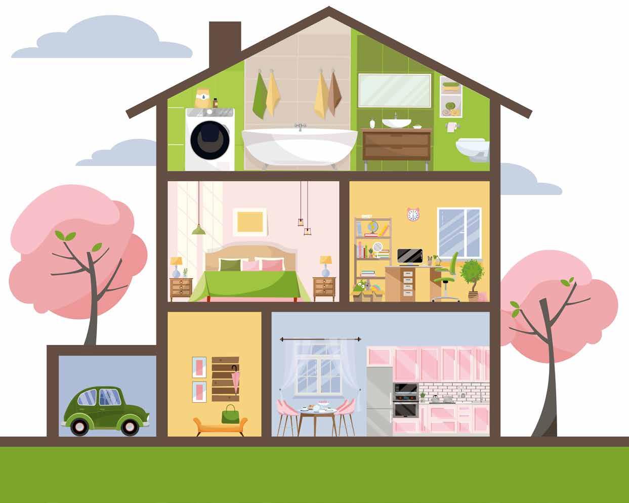 le rez-de-chaussée – le premier étage – le deuxième étage – la cuisine –le salon – la salle de bains – la chambre à coucher – le bureau – le jardin –le garage