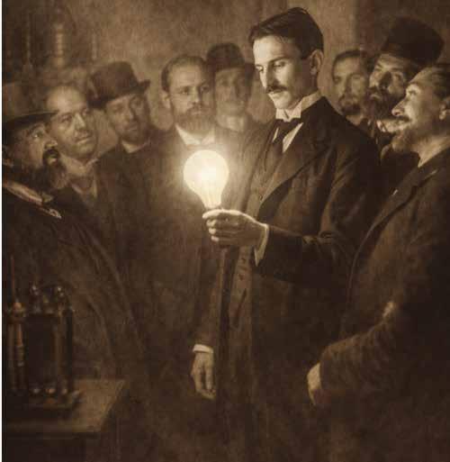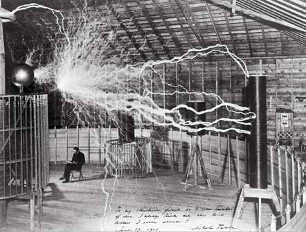 En toch zit Nikola Tesla rustig op een stoel, met een boek in zijn handen. De machine is een Tesla-spoel, een toestel waarmee hij experimenteerde met elektriciteit.