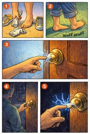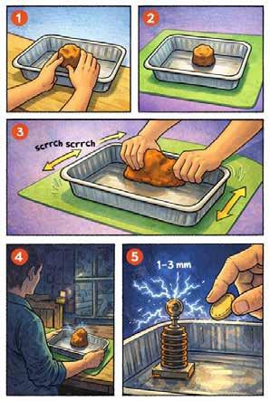 Witte vonken kronkelen door de ruimte, recht uit een machine achter hem.