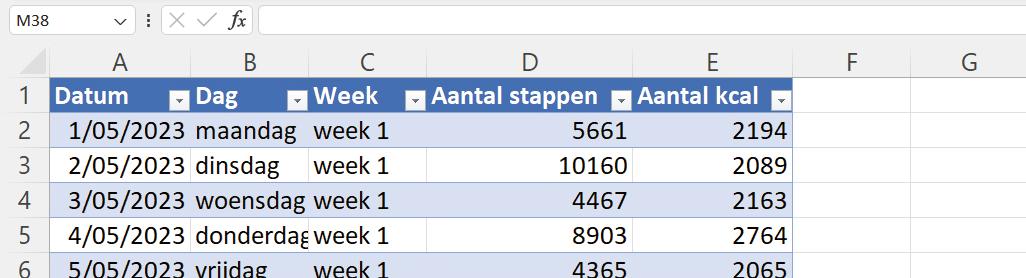 Open het Excelbestand ‘Beweging in de maand mei’. Een sporter heeft de data van zijn smartwatch in een Excelbestand geplaatst.