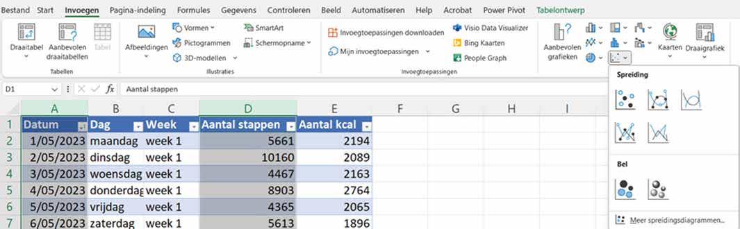 Plaats de datum terug in oplopende volgorde. Selecteer de kolom van de datum en de kolom van het aantal stappen. Klik op Invoegen, groep Grafieken en kies voor Spreiding met vloeiende lijnen en markeringen.