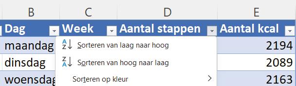 Je kan nu ook sorteren. Klik op het pijltje dat rechts van Aantal stappen staat, kies voor Sorteren van hoog naar laag. Alle cellen van de overeenkomstige rij worden mee verplaatst.