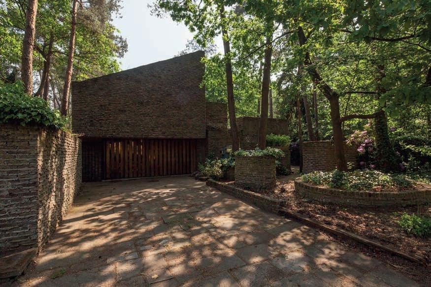 woning in een soort van groene canyon plaatsen, zoals Van Driessche het omschrijft. Het typische metselwerk van veldovensteen met plastisch uitpuilende mortelspecie echoot bewust de textuur en de kleur van de gegroefde schors van de grove dennen. De tuin is geheel ommuurd met halfsteense verspringende en overhoekse muren met hoogtes van 160 cm tot 200 cm en ondiepe nissen voor onder meer het stapelen van brandhout. De tuin is verder gestructureerd door planten bakken met variërende diameters van 120 cm tot 350 cm en hoogten van 30 cm tot 140 cm in hetzelfde typische metselwerk, dat er na meer dan 40 jaar nog onberispelijk uitziet. De derde ordenende factor zijn de tuinpaden in dezelfde veldovensteen met variërende breedten van 80 cm tot 150 cm. Architect Jos Van Driessche noemt de tuinpaden horizontaal metselwerk met aarde aan beide kanten. De tuinpaden vormen een rondweg en verbinden ruimere plankieren in veldovensteen die her en der aansluiten bij de gevels en tuinmuren. De totaalarchitectuur die zo eigen is voor dit werk van de ontwerper, creëert een twee-eenheid tussen de eigen woning en de tuin.