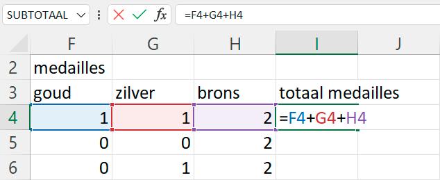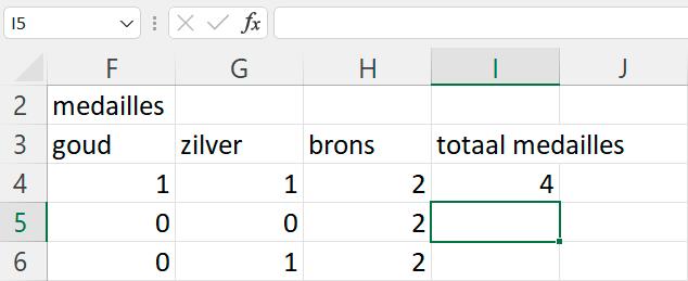 Om het totaal aantal medailles te berekenen, kan je dezelfde methode van daarnet toepassen maar het kan efficiënter door een functie te gebruiken.