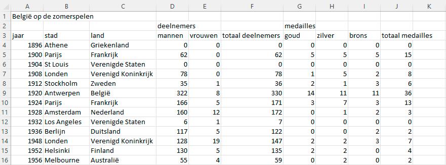 1 Bekijk in de werkmap opgOlympischeSpelen_België3 welke rijen er ontbreken.