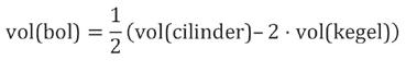 Nu wist Archimedes dat het volume van een kegel juist een derde is van het volume van de cilinder met dezelfde hoogte en grondvlak als de kegel. Dit staat bijvoorbeeld als Propositie 10 in boek XII van het boek van Euclides. Uit ons kegel-bol-cilinder evenwicht volgt dus dat het volume van een bol 1/6 is van het volume van de cilinder met hoogte en straal gelijk aan de diameter van de bol. Het volume van dergelijke cilinder (hoogte = straal = ) is gelijk aan , en dus dat van de bol .