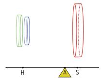 Nu had Archimedes het inzicht dat de cilinderschijf in om het even welke snijpositie in evenwicht gehouden wordt als we de twee andere schijven (zoals uitgesneden op plaats ) in het punt H plaatsen, waarbij dit punt H op een afstand 2r ligt van het steunpunt . De plaats varieert weliswaar van tot , terwijl het punt vastligt, maar de kegel- en bolschijf worden natuurlijk alsmaar groter. Misschien heeft de lezer problemen met het plaatsen van twee schijven in 1 minuscuul punt, maar we bedoelen dat het zwaartepunt van beide schijven zich ter hoogte van moet bevinden. Het evenwicht volgt uit de berekening van de verhouding van beide volumes (rechts op links):