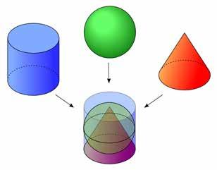 Bereid jullie dan nu voor op een confrontatie met de duizelingwekkende genialiteit waarmee Archimedes de volumes van de bol, de cilinder en de kegel met elkaar wist te vergelijken. Neem een cilinder, een kegel en een bol zoals in onderstaande figuur. We bestuderen de situatie waarbij de straal en de hoogte van de cilinder gelijk zijn aan de diameter van de bol, en waarbij de kegel juist in de cilinder past. Als we noteren voor de straal van de bol, dan is de straal van de cirkelvormige basis van zowel de kegel als de cilinder gelijk aan . Bovendien is de hoogte van de kegel gelijk aan die van de cilinder en ook gelijk aan de diameter van de bol.