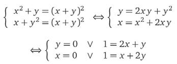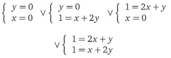 Hier komt wat logica bij kijken. Het stelsel is, logisch bekeken, van de vorm . Het laatste stelsel is een klassiek stelsel van twee eerstegraadsvergelijkingen in twee onbekenden. Met de substitutie- of combinatiemethode vind je als oplossing . De drie andere stelsels los je op het zicht op. Er zijn dus vier gevallen waarbij het niet uitmaakt hoe je uitspreekt