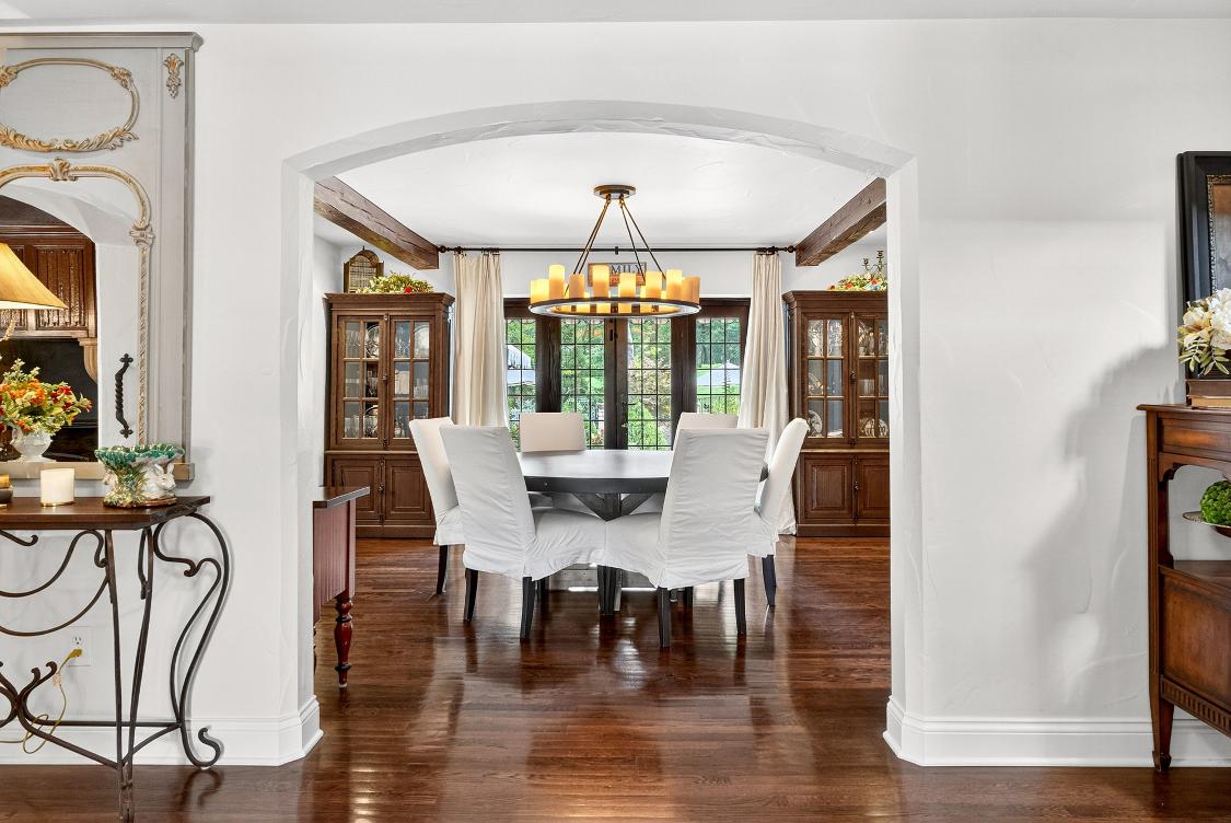 - Formal living room with wood-burning fireplace,French doors,chandeliers, sconces,wood paneling,and built-ins