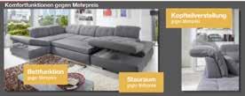 Schlafsofa Campino de Luxe Liegefläche ca. 200 x 150 cm, Stellmaß ca. 207 x 102 cm, Boxspring Unterfederung mit Bettfunktion und Bettkasten, inkl. 2 Rückenkissen und 2 Plaids, Holzfüße schwarz, Stoff silber/Kontrastnaht silber 0616003701 mit Bettfunktion, Topper und Bettkasten 799,99 36 x mtl ab 24,- * oder mit LED-Beleuchtung * Nähere Informationen erhalten Sie auf der Rückseite. 4 849,99 36 x mtl ab 26,- * oder 549,99 459,99 699,99 36 x mtl ab 21,- * oder 279,99 WSV WSV 549,99 mit Elektromotor und Aufstehhilfe TV-Sessel Toronto XXL Stoff graubraun, belastbar bis 150 kg 0140014800 belastbar bis 150 kg mit Federkern Couchtisch Herbert Artisan Eiche Nachbildung/anthrazit, ausziehbar, B/H/T ca. 110(150)/58-76/70 cm 0160001300 399,99 höhenverstellbar Couchtisch Iguan Eiche Sonoma/alpinweiß, B/H/T ca. 110/45/67 cm, mit 2 Schubkästen 1028000801 119,99 Couchtisch Eike Old Wood Dekor/schwarz, B/H/T ca. 110/50/68 cm 0160000900 139,99 399,99 Relaxsessel Rosie Stoff beige, Gestell naturfarben, 360° drehbar, inkl. Hocker mit Stauraum, belastbar bis max. 120 kg 0436011901 mit Relaxfunktion mit Hocker mit Stauraum 39,99 Couchtisch Venta Betonoptik/alpinweiß, B/H/T ca. 100/44/59 cm 1028001005 Kernbuche massiv Couchtisch Fenja Kernbuche massiv, B/H/T ca. 104/44/62 cm 0213004712 139,99 Wohnwand Stone weiß/betonfarbig, B/H/T ca. 304/194/48 cm, mit LED-Beleuchtung 0873013100 Wohnwand Memphis Artisan Eiche Nachbildung/ graphit, B/H/T ca. 287/197/47 cm, mit LED-Beleuchtung 0189001610 mit LED-Beleuchtung Wohnwand Lyon Alpinweiß/weiß Hochglanz, B/H/T ca. 298/198/42 cm mit LED-Beleuchtung, mit Softclose 1028003000 mit LED-Beleuchtung 799,99 36 x mtl ab 24,- * oder mit LED-Beleuchtung Wohnwand Boost Flagstaff dunkel/Matera Nachbildung, B/H/T ca. 318/204/45 cm, mit LED-Beleuchtung 0873002800 mit LED-Beleuchtung Schlafsofa Lilly Liegefläche ca. 125 x 196 cm, mit Kissen, Stoff dunkelgrau 1007002500 mit Bettfunktion und Bettkasten Big Sofa Moldau Breite ca. 310 cm, mit Kissen, mit Federkernpolsterung, Stoff grau 1007006207 ca. 310 cm breit mit Federkern 849,99 36 x mtl ab 26,- * oder TV-Sessel Siena Stoff braun, mit 2 Motoren und Aufstehhilfe, belastbar bis max. 115kg 0140015800 599,99 Couchtisch Peking Eiche braun/Gestell Metall schwarz, Ø/H ca. 80/47 cm 0579001200 169,99 Front massiv Wohnwand Korsika Kernbuche teilmassiv geölt, B/H/T ca. 351/204/50 cm, ohne Beleuchtung 0271002000 Alles Abholpreise Wohnwand Fun Plus Basalt/Eiche Altholz Nachbildung, B/H/T ca. 320/205/47 cm, mit LED-Beleuchtung 0189004905 Dreisitzer Acun Liegefläche ca. 109 x 190 cm, 1021000400 Zweisitzer Acun Liegefläche ca. 109 x 127 cm (o. Abb.) 1021000401 249,99 369,99 WSV mit Elektromotor und Aufstehhilfe WSV 1299,99 36 x mtl ab 39,- * oder WSV mit Federkern mit Federkern Garnitur Acun mit Bettfunktion, mit Bonellfederkern, mit Kissen