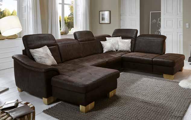 aus: 1 Dreisitzer links, 1 Recamiere rechts, mit Nosagfederung, mit Kopfteilverstellung, mit Holzleiste in Eiche, Stellmaß ca. 285 x 171 cm, Stoff