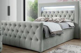 Lit double couchage env. 180 x 200 cm, avec fond de verre-éclairage dans dossert moins, tabouret articulé,