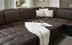 Salon panoramique Infinity comprenant: 1 canape avec accoudoir à gauche, 1 canapé 2,5 places, 1 canapé 1,5 places avec pouf, incl. réglage du appuietête, encombrement env. 185 x 341 x 243 cm, tissu brun, pieds chêne sauvage massif, sans coussins-déco 0755001500