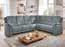 Salon panoramique Viktor comprenant: 1 récamiere à gauche, 1 canapé 2 places avec fonction convertible, 1 méridienne à droite avec coffre à literie, avec 2 coussins déco, encombrement env. 225 x 343 x 179 cm, couchage env. 268 x 141 cm, tissu bleu gris