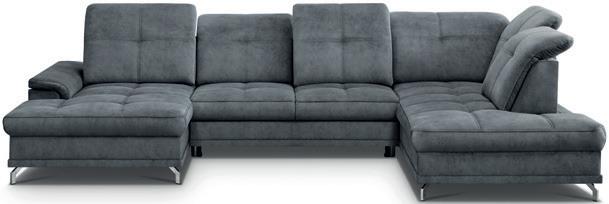 comprenant: 1 canape avec accoudoir à gauche, 1 canapé 2,5 places avec réglage du siège, 1 angle aigu, 1 canapé 1,5 places avec réglage du siège et pouf términal à droite, à ressorts, tissu gris, pieds alu brossé, sans coussins-déco