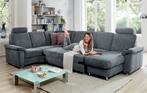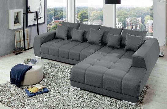 comprenant: 1 canapé 3 places avec accoudoir à gauche, 1 angle, 1 canapé 2 places avec accoudoir à droite, sans coussins-déco, encombrement env. 303 x 245 cm, tissu gris