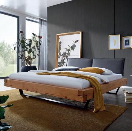 180 x 200 cm, épicéa massif teinté ambre et huilé, patins revêtus par poudre noir, avec tête rembourrée, sans sommier, sans matelas, sans coussins-déco, sans couverture-déco