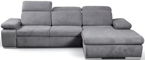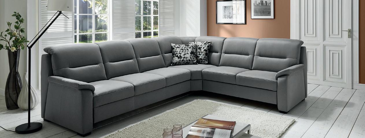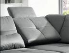 bestehend aus: 1 Zweisitzer mit Bettkasten, Kopfstütze und Armlehne links, 1 Ecke mit beidseitiger Relaxfunktion, 1 Dreisitzer mit Bettfunktion, Kopfstütze und Armlehne rechts, Stellmaß ca. 219 x 266 cm, Liegefläche ca. 120 x 202 cm, Stoff grau