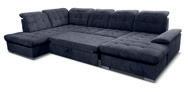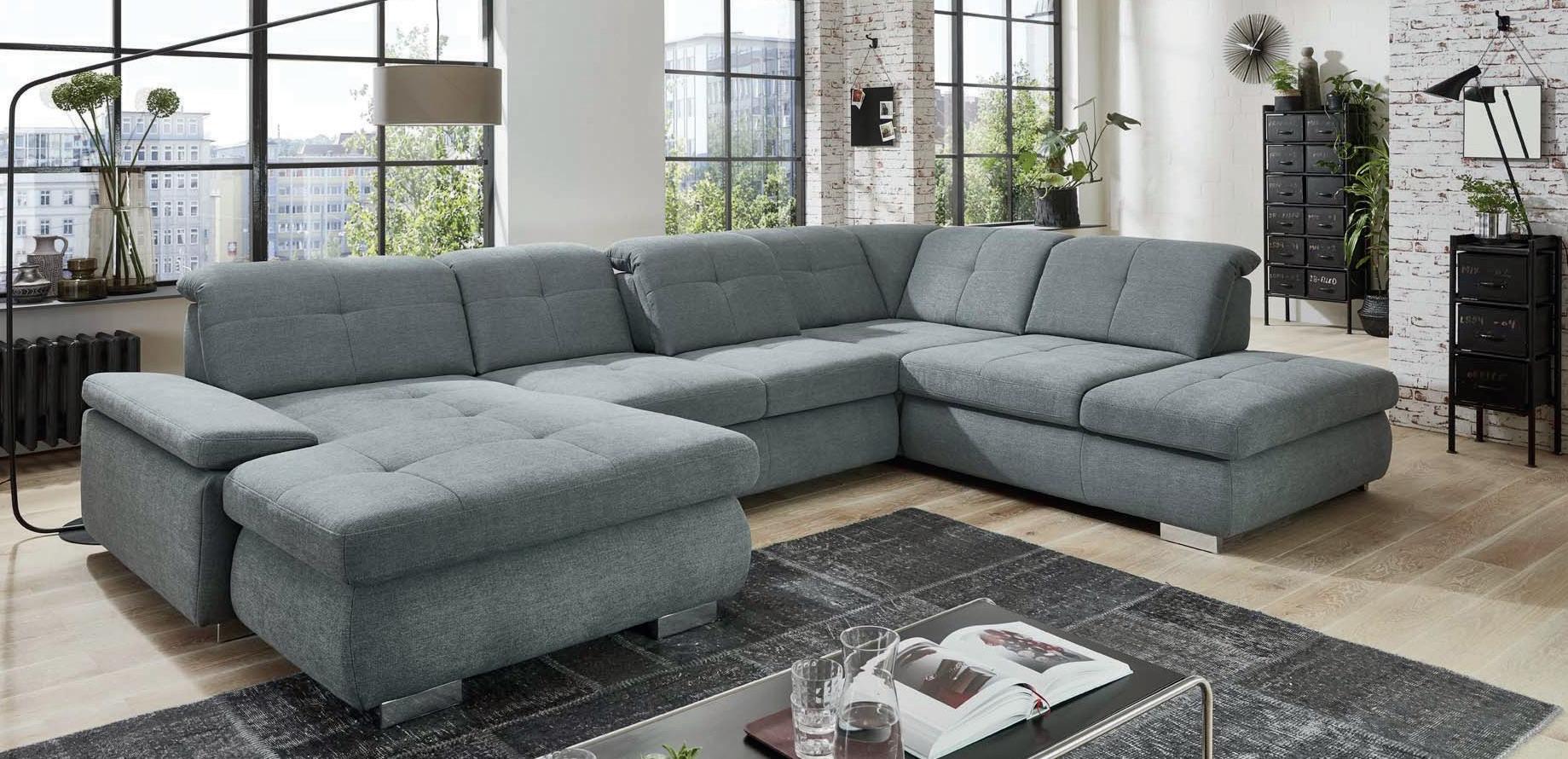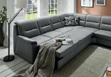 bestehend aus: 1 Recamiere links, 1 Zweisitzer mit Schlaffunktion, 1 Ottomane rechts mit Bettkasten, mit 2 Zierkissen, Stellmaß ca. 225 x 343 x 179 cm, Liegefläche ca. 268 x 141 cm, Stoff blau grau